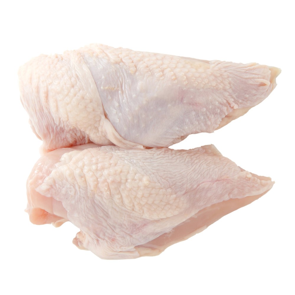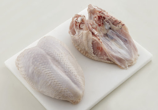 Alternatively, 3 portions can be made by removing the Wishbone and then cutting along the breastbone. Neck skin should not be included in a Chicken Breast with Ribs.